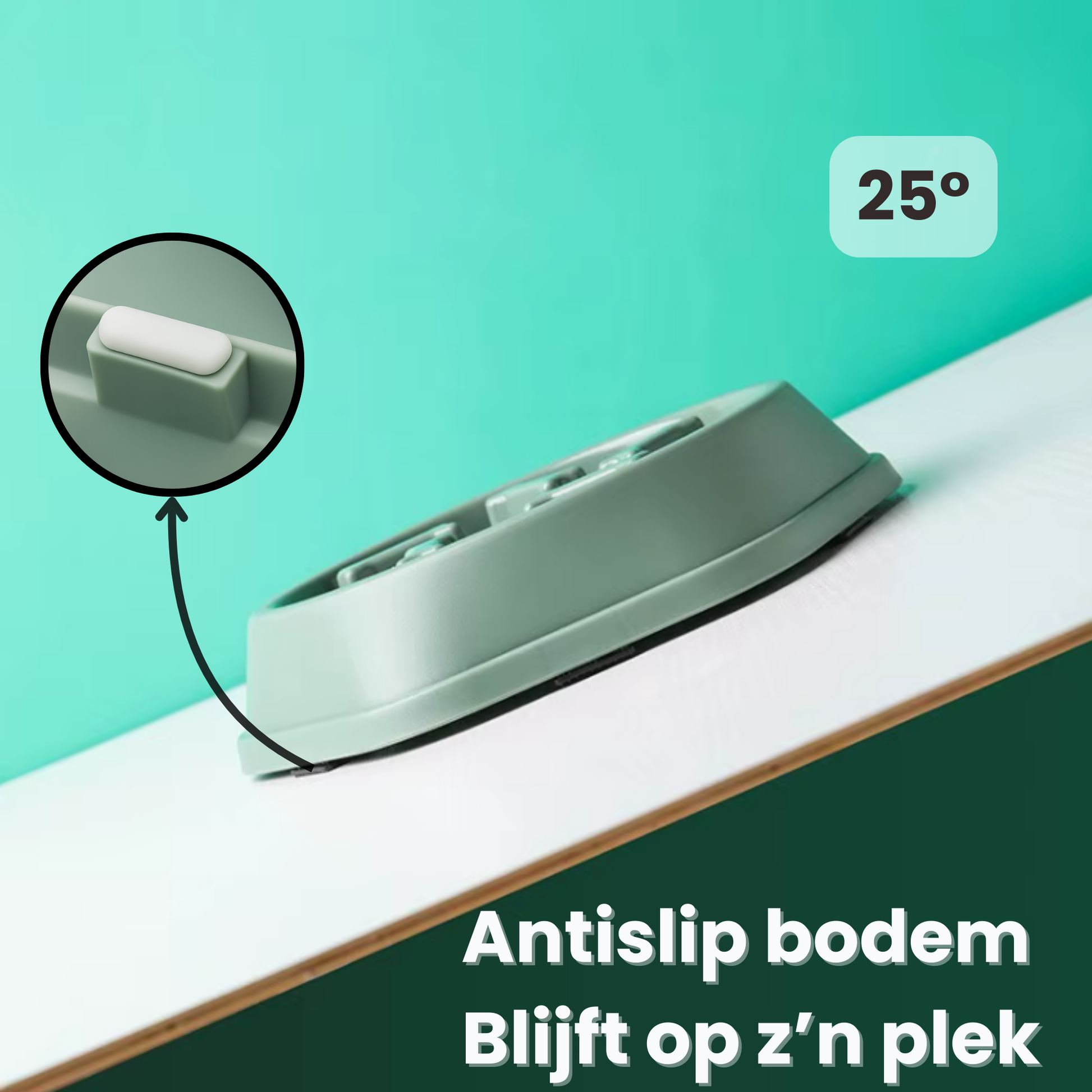 De onderzijde is antislip. Op de onderlegger staat hij extra stabiel.